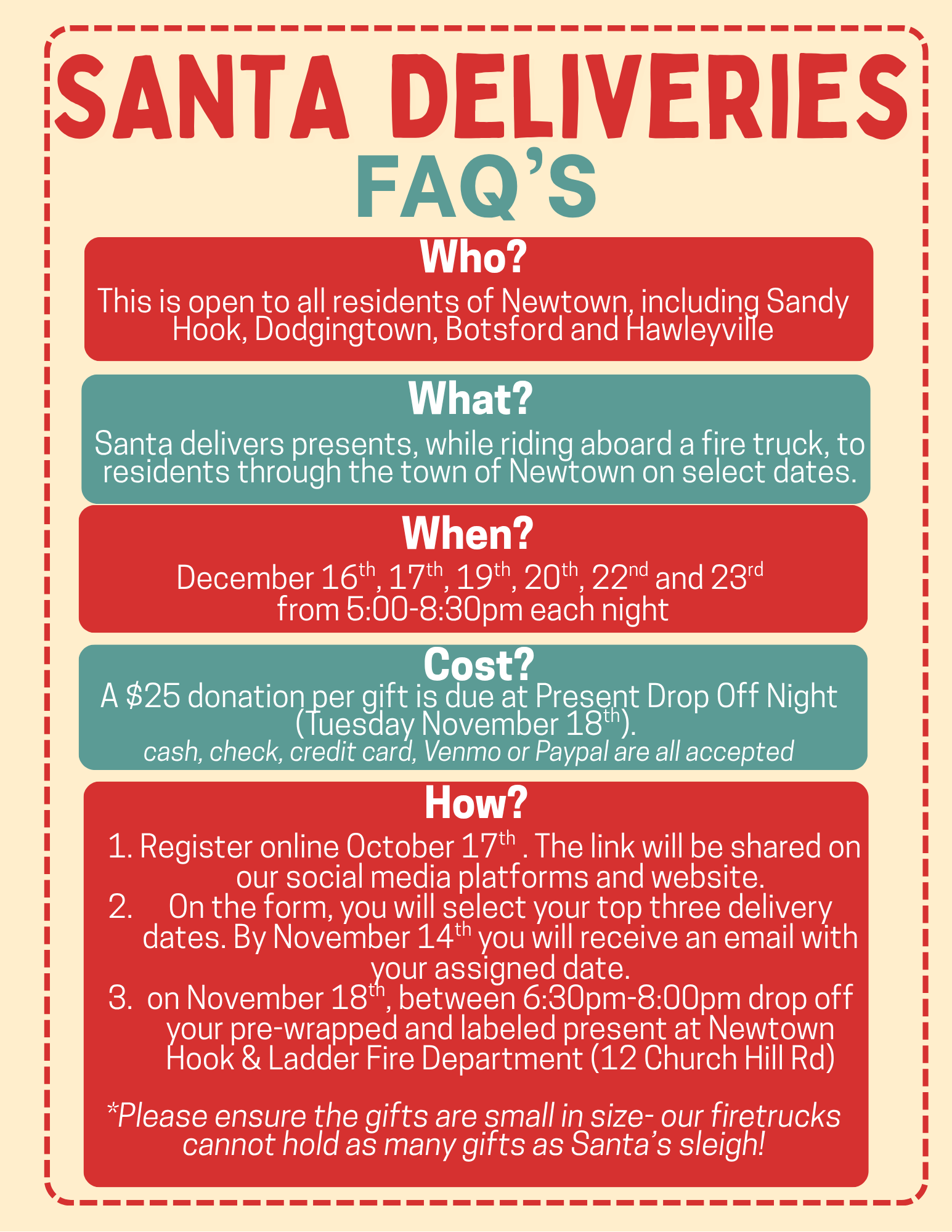Upcoming Events 2025 Santa DeliveriesClick Here to Register Dec 13 to Dec 23 Santa Deliveries Wed, Dec 13, 2023 5:00 PM Sat, Dec 23, 2023 8:00 PM Google Calendar ICS View Event → Oct 28 Fall 2023 Boot Drive Saturday, October 28, 2023 9:00 AM 3:00 PM Newtown Hook & Ladder (map) Google Calendar ICS View Event → Oct 14 2023 Open House Saturday, October 14, 2023 10:00 AM 2:00 PM Newtown Hook & Ladder (map) Google Calendar ICS View Event →